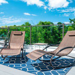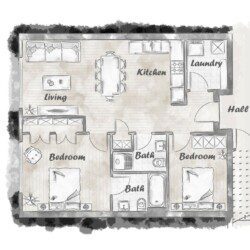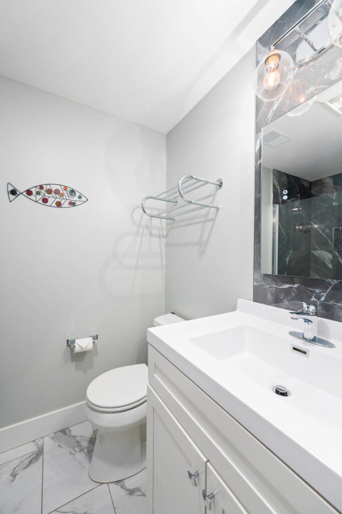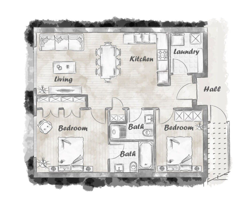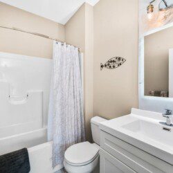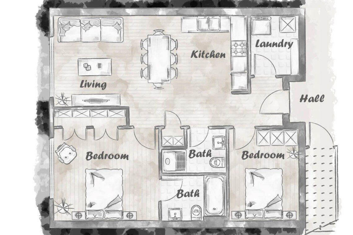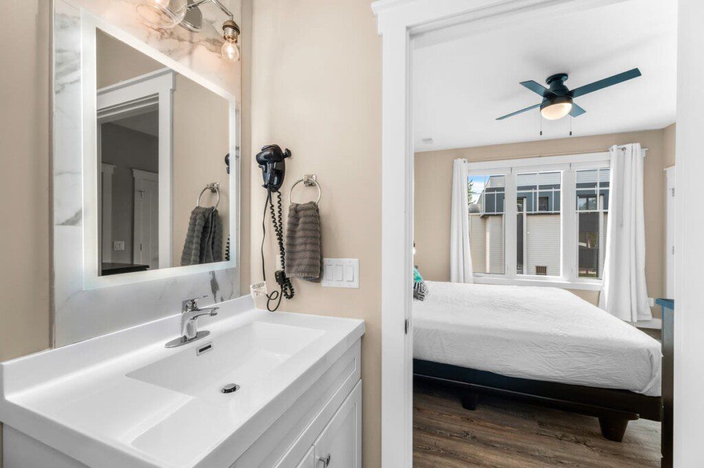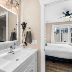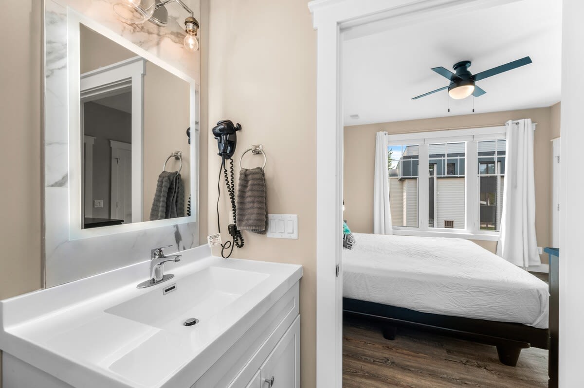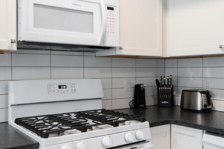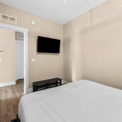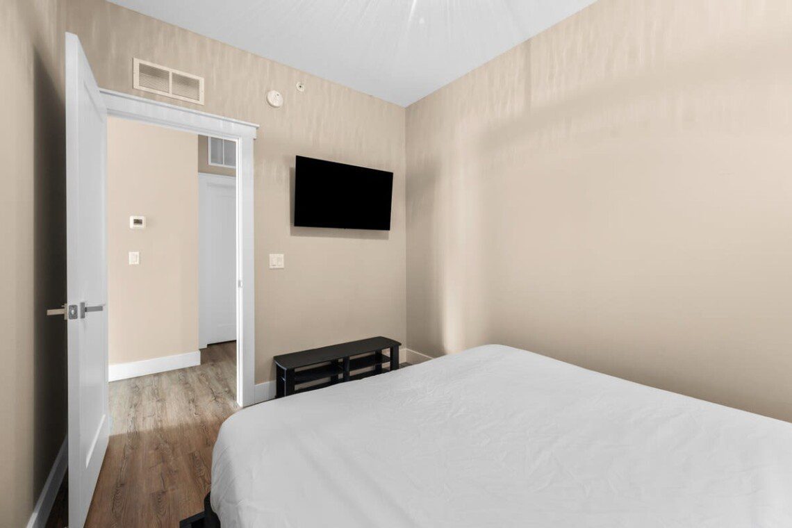 Walk into our master bedroom that has a king size bed and 2 closets to fit all of your belongings (or new purchases). The master bedroom also has an ensuite bathroom, stocked with toiletry essentials. The guest bedroom has a queen bed along with a flat screen tv. Don’t worry if you decide to extend your stay, each unit comes with their own washer and dryer along with basic laundry supplies.