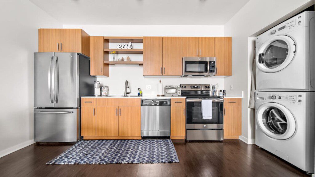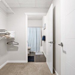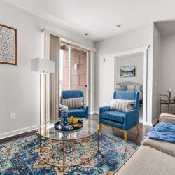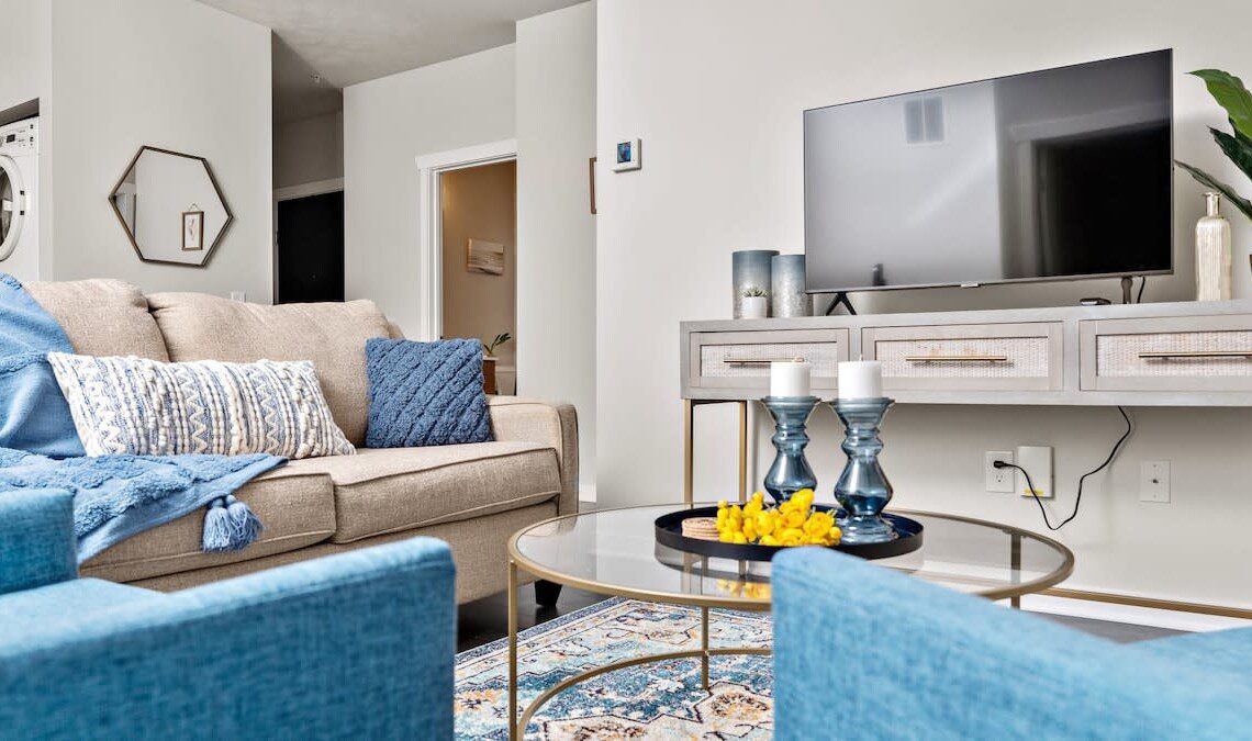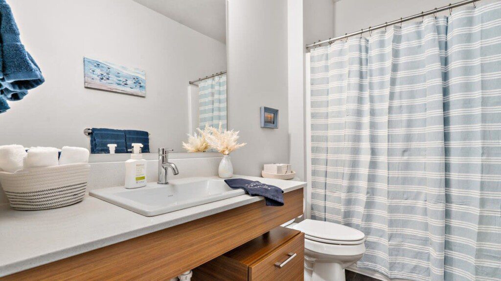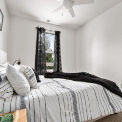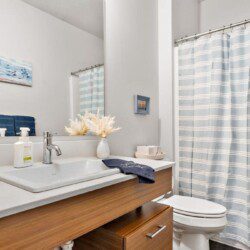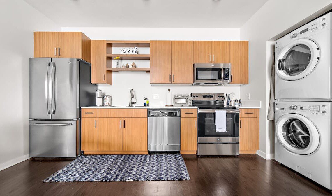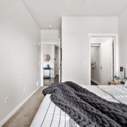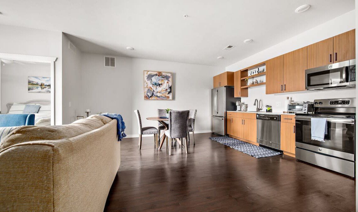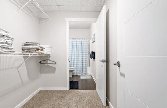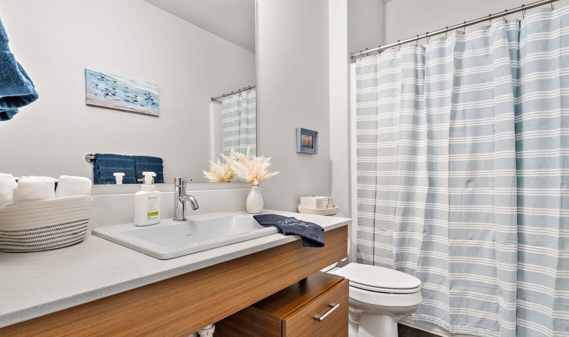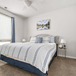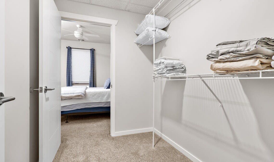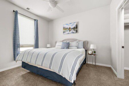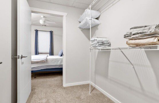 This first floor unit has everything that you need to enjoy a comfortable stay in Traverse City. Walk into our master bedroom that has a king size bed and a spacious walk-in closet to fit all of your belongings (or new purchases). The master bedroom also has an ensuite full bathroom, stocked with toiletry essentials. The guest bedroom has a queen bed, ensuite full bathroom, and a spacious walk-in closet. Don’t worry if you decide to extend your stay, each suite comes with their own washer and dryer along with basic laundry supplies.