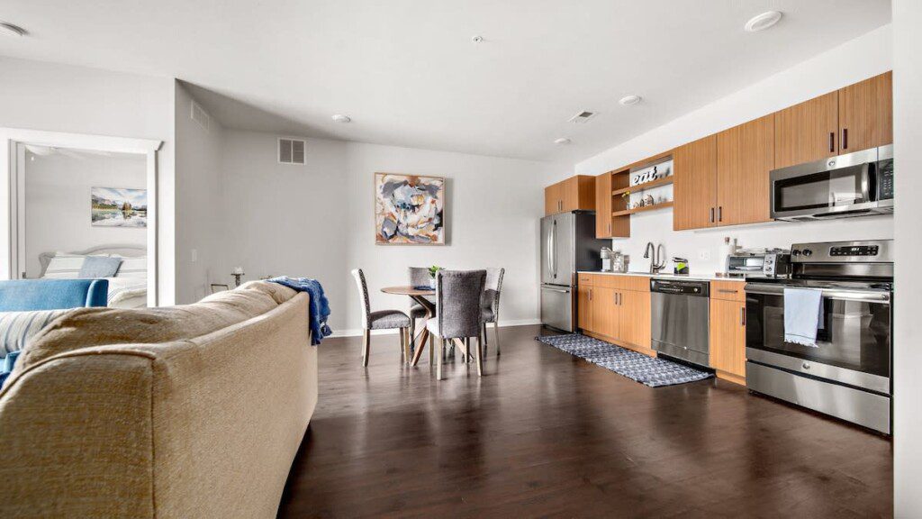 In the living room you will find a cozy full sized pullout couch along with a large flat screen TV. Trailside45 is just a mile and a half away from downtown Traverse City, known for their delicious restaurants. If you choose to stay in for a night, the kitchen is stocked with all the kitchen essentials (utensils, basic cookware, dishes, keurig). A few K-cups will be provided to get your vacation started on the right foot.